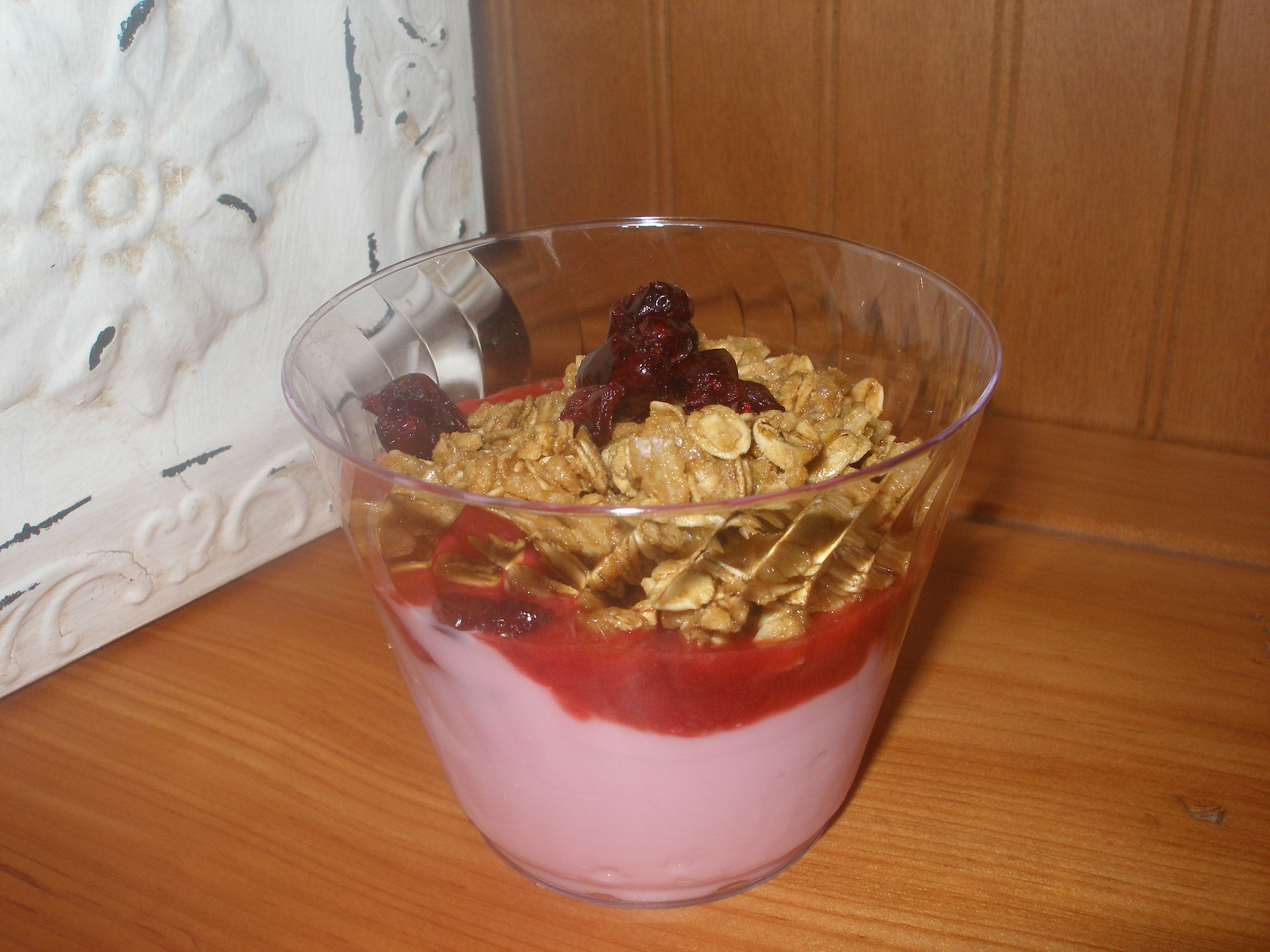 The next two weeks will be filled with red, pink, and chocolate candy. Tonight, I made my girls this special strawberry parfait. I started with Stonyfield’s strawberry yogurt, then layered it with strawberry sauce, and finally topped it with Cascadian Farms Granola and dried cranberries. The strawberry sauce will actually be the filling that I will be using in Anna’s birthday cake this weekend. It’s super easy and also goes great on top of whole grain waffles or pancakes! Oh, and you must serve these parfaits in a fancy glass. I would love to know what healthy treats you plan on making for your family this Valentine’s Day- so leave a post and share your great idea!