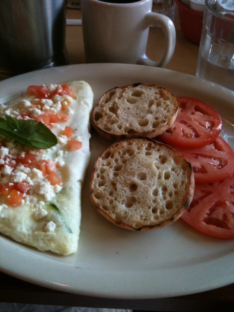 We also love First Watch. It is a chain that is slowly starting to pop up around the country. They serve breakfast all day along with sandwiches, soups, and salads. They have a lighter section in their menu and offer egg whites and egg substitutes at no additional charge. Here is a picture of my turkey, feta, and tomato egg white omelet.