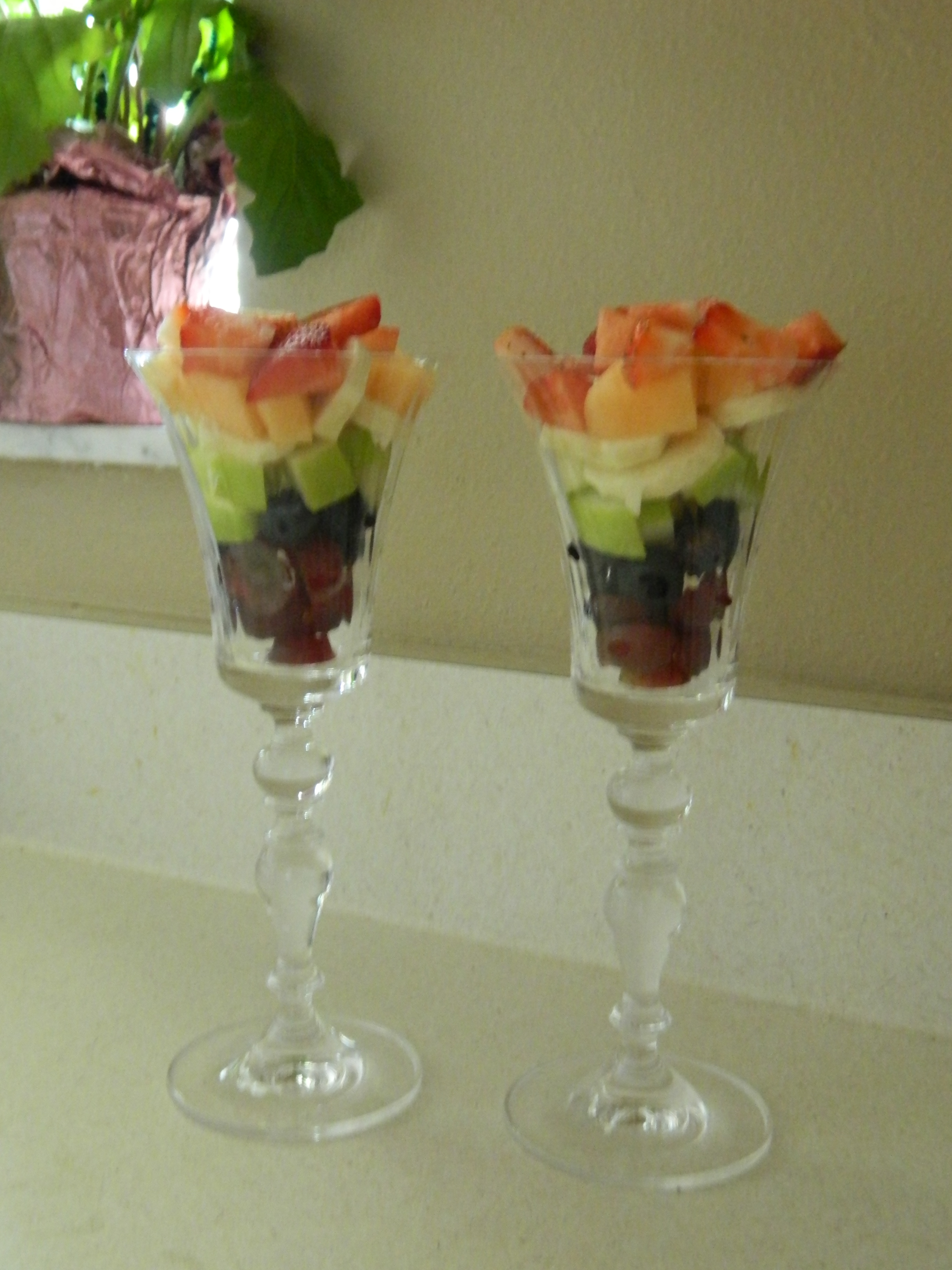 A simple layering of fruit that is a feast for the eyes and for the tummy! I used strawberries, cantaloupe, banana, green apple, blueberries, and purple grapes.