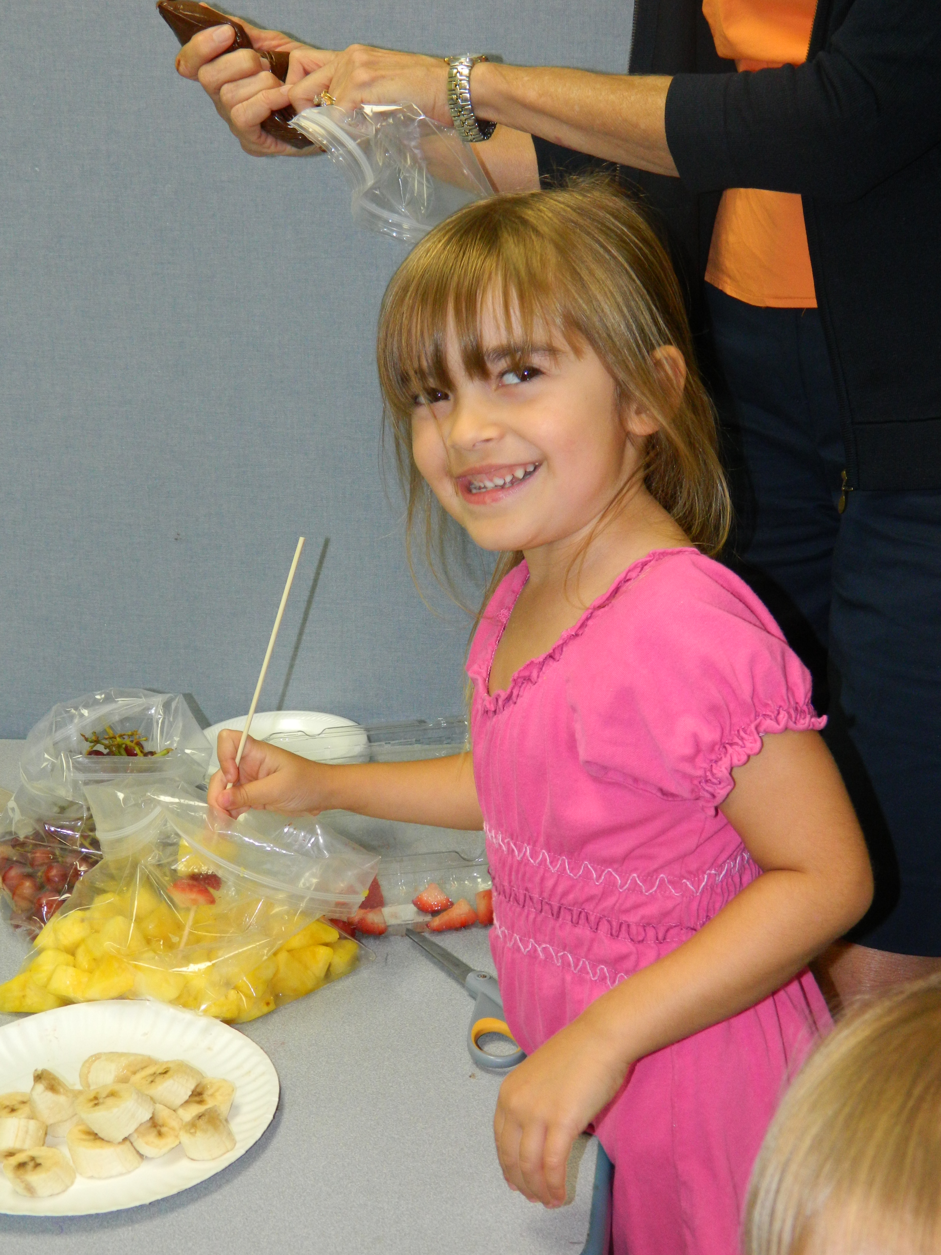 We finished the evening by making fresh fruit skewers with chocolate. Once again, they were able to choose which fruits to slide onto their skewer (I had pineapple, banana, strawberries, and grapes), and then my mother-in-law helped them drizzle the chocolate over the fruit. To make the chocolate, I placed semisweet chocolate chips in a zip-top bag, placed it in a pitcher of very warm water, and squeezed the chips every few minutes until they were melted. Snip just a small hole at the bottom corner of the bag, and you have an instant “drizzler”!