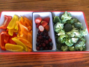 As I prepare dinner and/or lunch, I place fresh fruits and vegetables on the table. My kids know that they are more than welcomed to come up and snack off the tray while their meal is being prepared. I place hummus, yogurt-based dressing, or salsa on the table to go along with the crudite. By the time they sit down to eat their main course, they have eaten a good dose of nutrients, vitamins, and antioxidants!