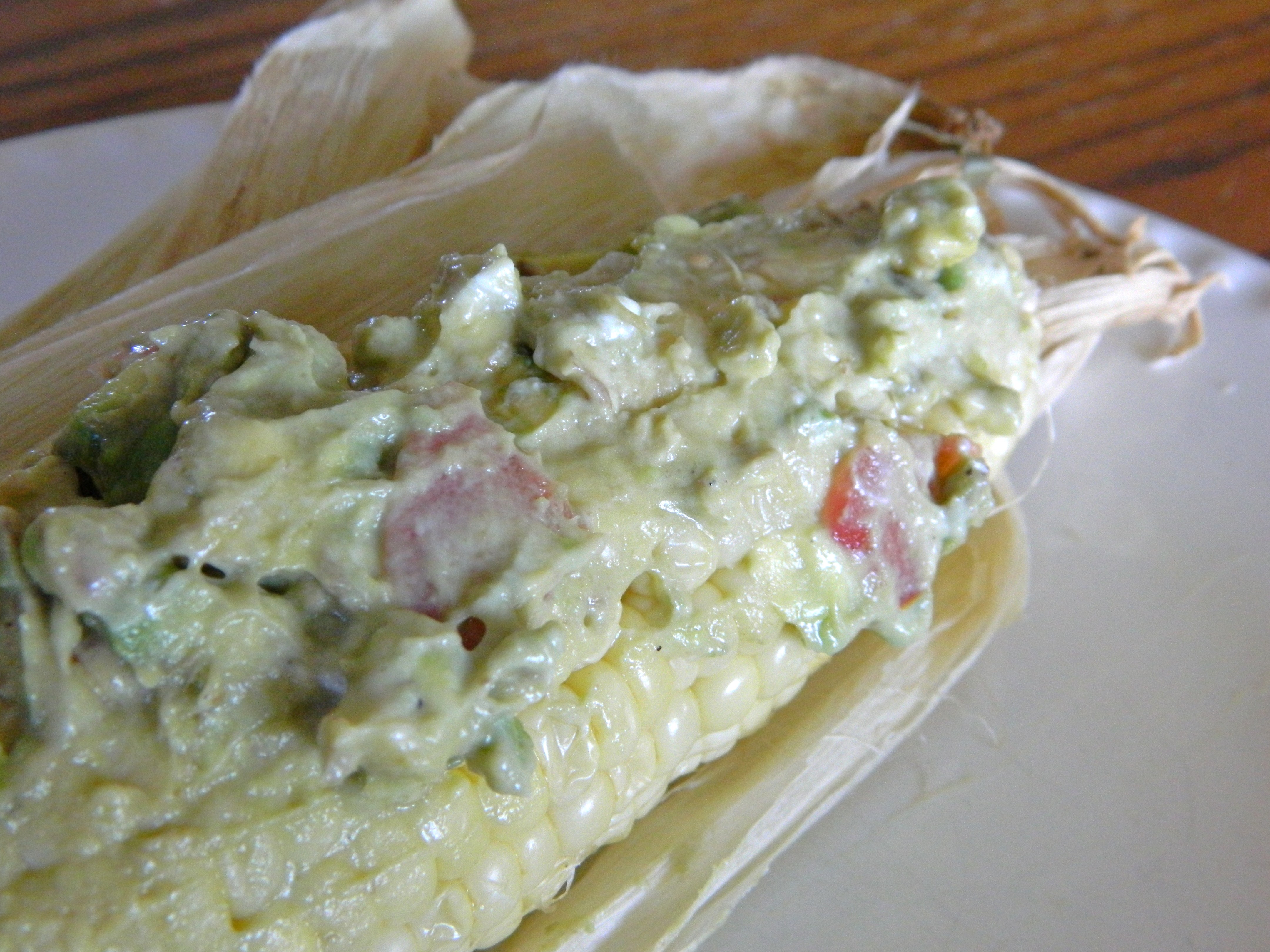 Tonight we roasted some corn on the cob in the oven. Who needs butter when you’ve got guacamole? This is a delicious combination!