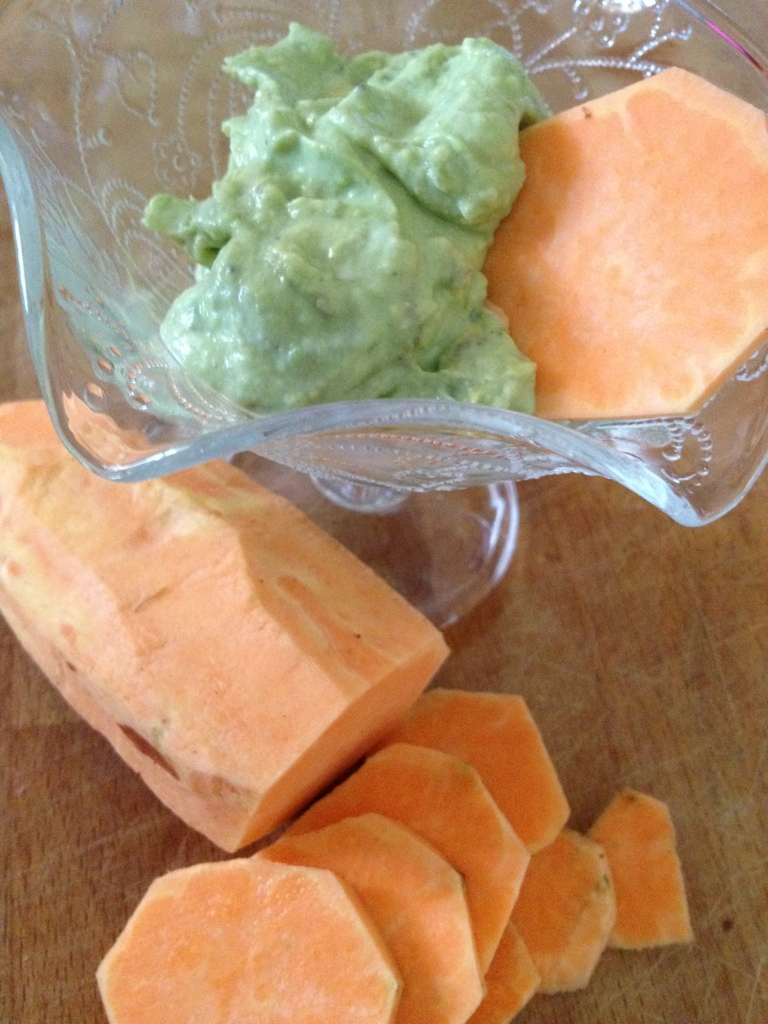 Truth be told, my husband and kids do not care much for sweet potatoes. However, when I gave them sweet potato “chips” (which is peeled and sliced raw sweet potato) to dip into homemade guacamole, they love the combination! The sweet potato slices are great dippers because they are just slightly sweet without an overpowering flavor, and they also have a bit of a crunch like a chip.