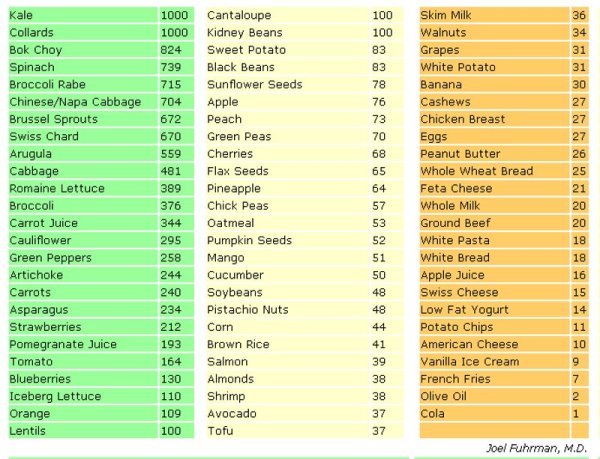 It is often stated that junk food is cheap and health food is expensive. This can be true, but when choosing foods that satisfy and promote overall health, you can actually come out ahead of the budget game (i.e. less trips to the doctor and pharmacy and less money spent there). Knowing which foods do indeed pack more “bang for your buck” allows you to feed your family the healthiest choices without breaking the bank. The chart below is a ranking created several years ago, Dr. Joel Fuhrman. It presents a way for scoring and ranking foods by their level of nutrient density – the nutrients per calories. The higher the nutrients per calorie, the higher the ranking. This system is named the  A.N.D.I. or Aggregate Nutrient Density Index. Levels of the following are used to give a food their ANDI score: