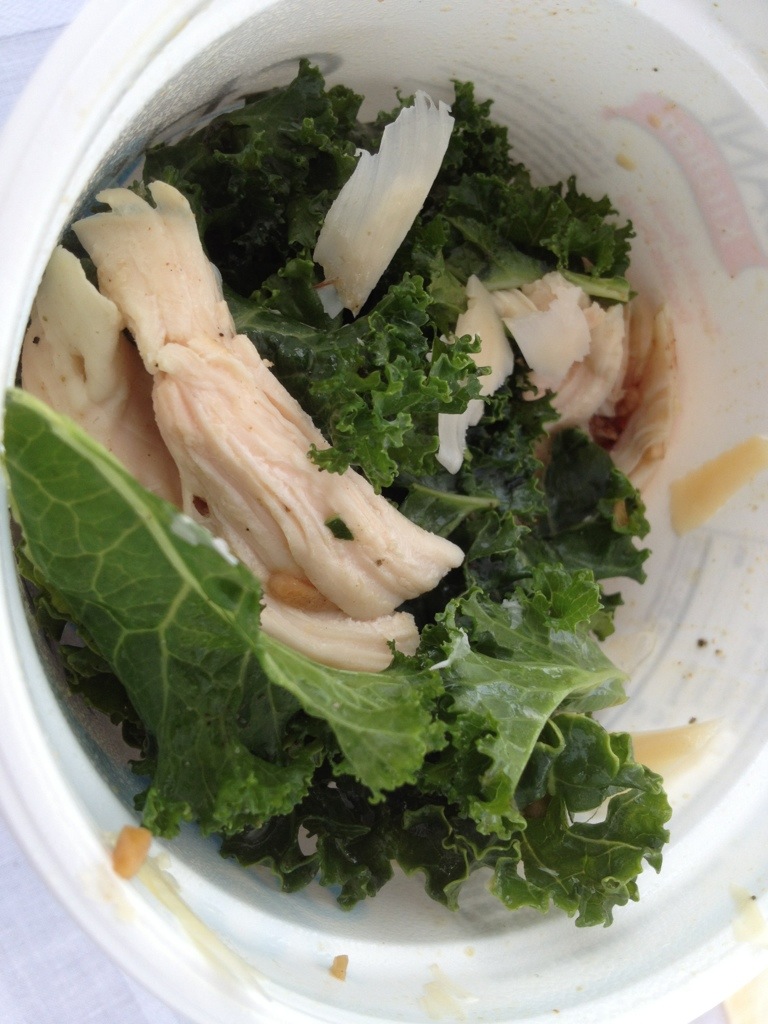 We all have those days that are packed full, and we need to eat on the run. When I was at the Patrick Island Market the other day, I had to take something with me for lunch so I took a roasted chicken Caesar salad. To make it an extra-easy meal, I wanted it already dressed and ready to be eaten so I used kale rather than romaine. The heartiness of the kale keeps the salad from wilting because we all know that soggy salads are not so scrumptious. I placed my salad in one of my washed out Chobani yogurt containers (32 oz one), placed a plastic fork in it, and snapped on the top. At lunchtime, I grabbed my Chobani container, popped it open, and lunch was served!