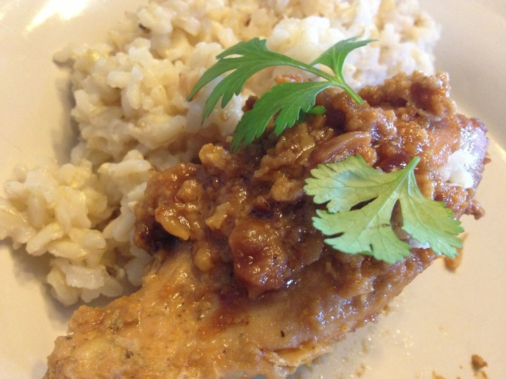 Coat bottom of the crock pot with coconut oil. Place in chicken. In a medium bowl, mix all remaining ingredients except for the cilantro. Pour the mixture over the chicken. Cook for 6 hours. Serve over whole grain noodles or brown rice and top with chopped fresh cilantro.