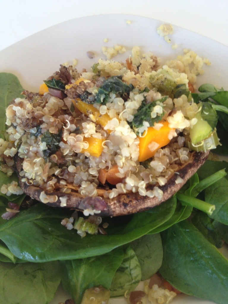 I defrosted some quinoa and then sautéed some carrots, celery, kale, and garlic. These veggies were tossed with the quinoa, placed on the roasted Portabello from the previous night’s dinner (For the portabello I used olive oil, s&p, and balsamic vinegar and roasted it for 20 min at 400). I placed it in the microwave to heat through and then added some fresh yellow pepper to the top and served it on a bed of spinach. Voila!