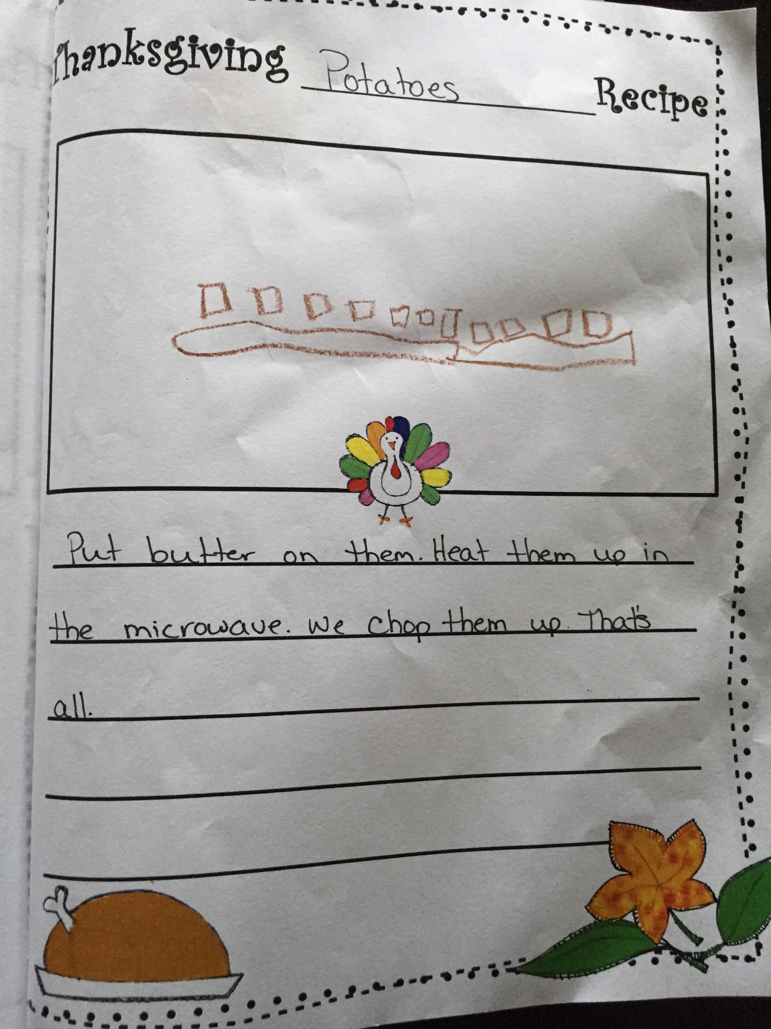 Thanksgiving Cooking 101: Meal prep through the eyes of my son. I love how he watches me and incorporates what he knows into the recipes. Thanks to his wonderful preschool teacher, Mrs. Sink, for putting this together.