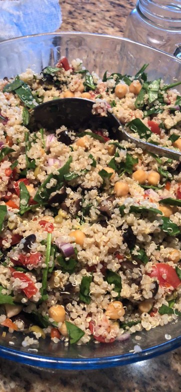 Zest and juice lemons over the cooked grains, add onion, garlic, nutritional yeast, and pepper and fold in. Add in the vegetables and stir together. Cover and chill for at least 2 hours. This will last several days in the refrigerator.