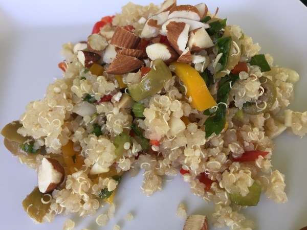 After making my cilantro tabbouleh, I had enough quiona to make another dish. While rummaging through the fridge, I found some mini peppers and decided to create a spanish style quinoa bowl. I did make a mental note to make my smoked almonds next time rather than using just raw almonds. The smoky flavor of my roasted almonds would be perfect for this!