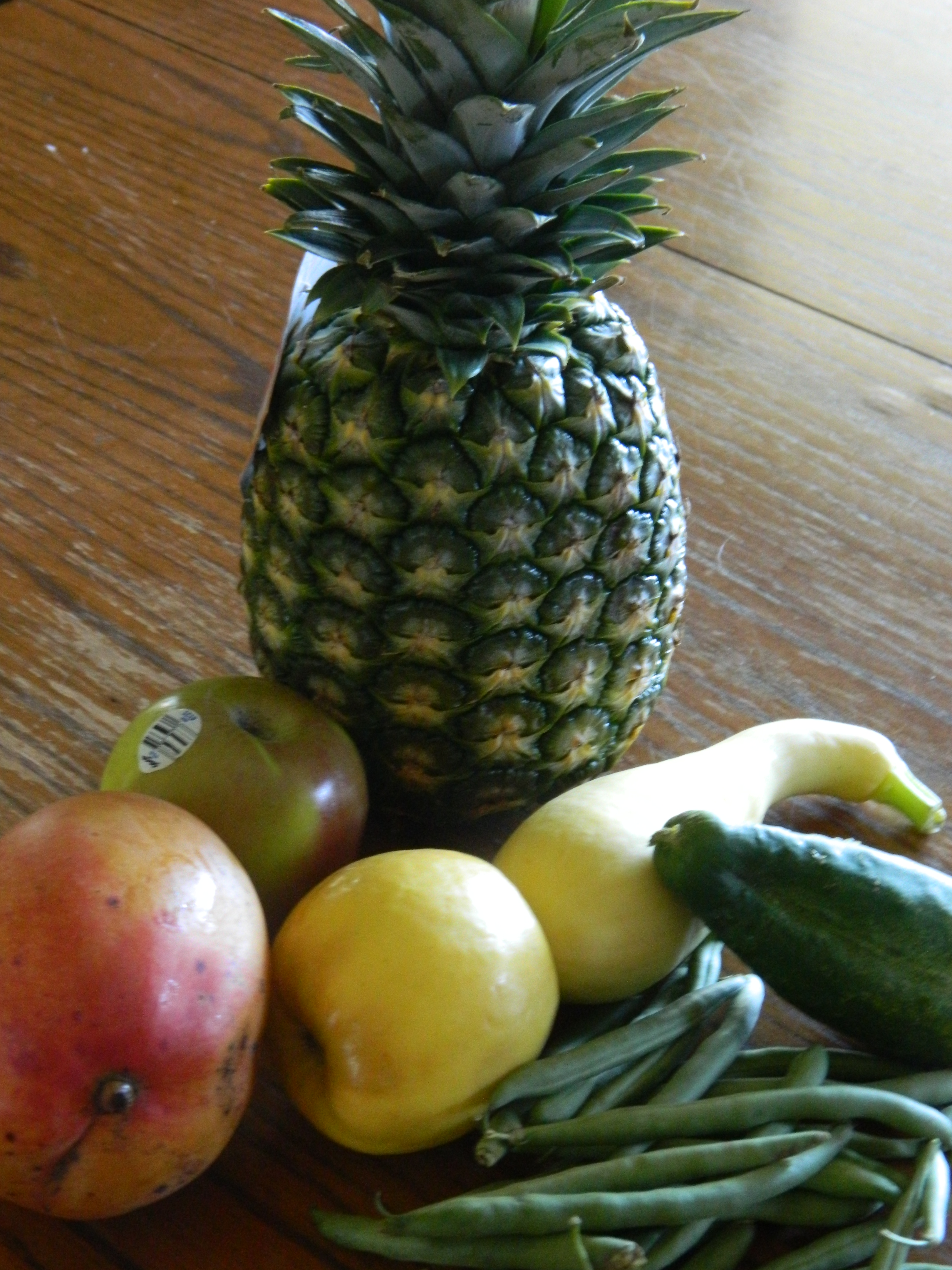 Today I took the kids to the local farmer’s market with the intent of allowing them to choose which fruits and veggies to buy to enjoy with our lunch and for the next few days. Aleyah picked out pickling cucumbers and a pineapple. Anna chose a mango and yellow squash, while Joel wanted apples (so adventurous!).